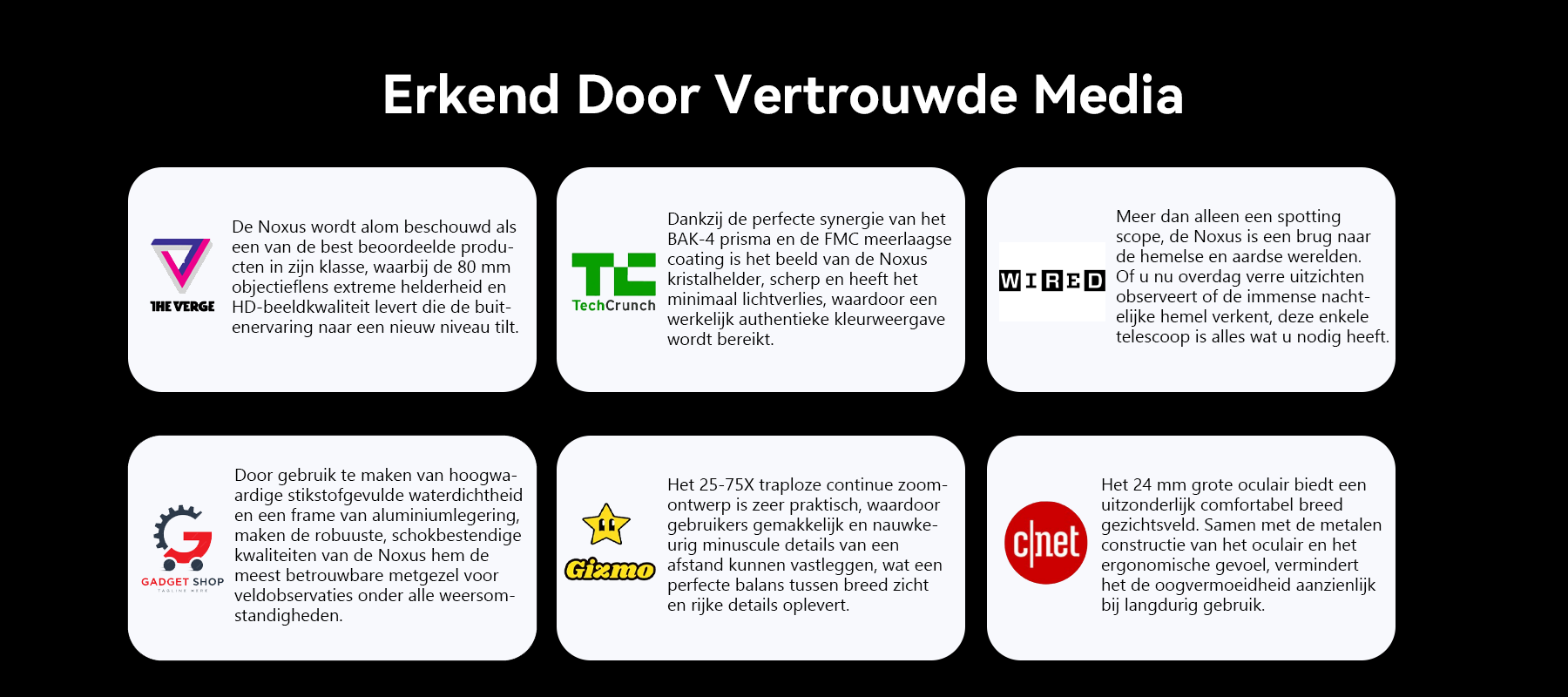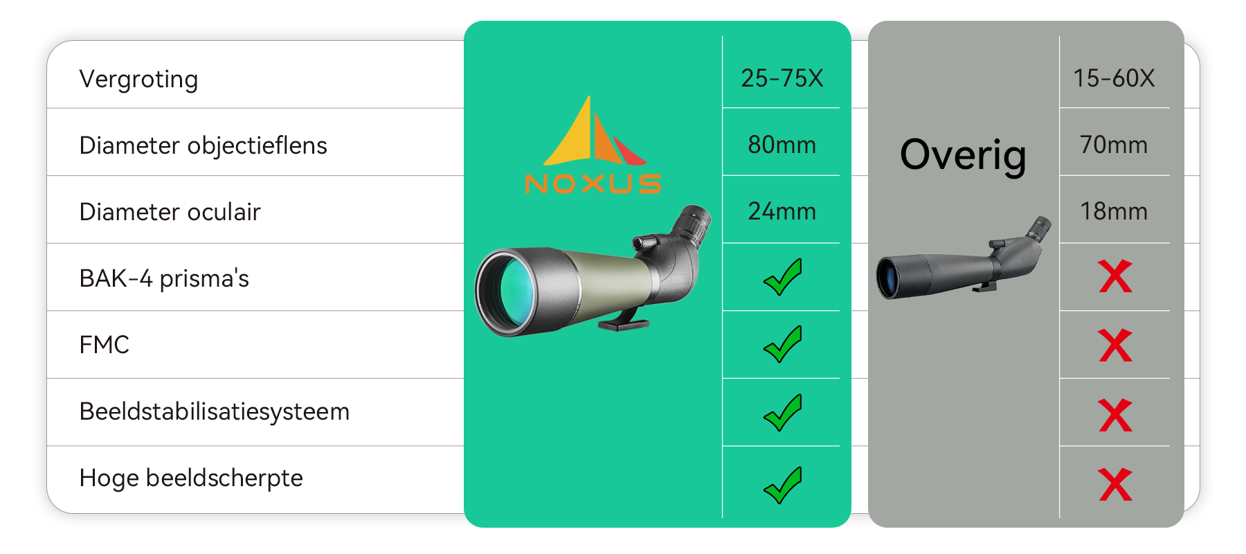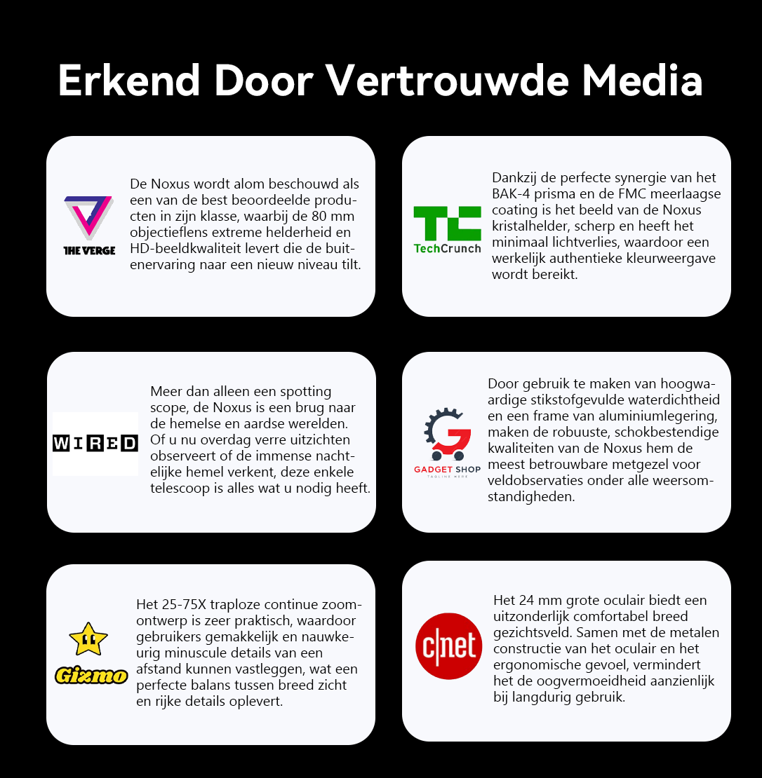 Dit leidde tot Noxus. Het merk belooft hoogwaardige optiek en stabiele techniek te gebruiken om heldere en comfortabele observaties over lange afstanden te leveren. De missie van Noxus: Iedereen helpen de natuur te verkennen met helderheid, gemak en precisie.